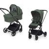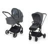El ligero chasis que plegado se mantiene de pie es de aluminio con detalles cromados puede equiparse con el espacioso capazo extraíble y plegable para un plegado compacto, luego con la silla de paseo reversible y plegable orientada hacia delante y hacia atrás con respaldo ventilado, que puede utilizarse desde el nacimiento hasta los 22 kg 4-5 años aprox
