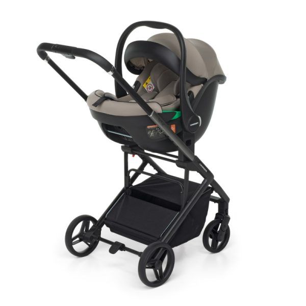 El ligero chasis que plegado se mantiene de pie es de aluminio con detalles cromados puede equiparse con el espacioso capazo extraíble y plegable para un plegado compacto, luego con la silla de paseo reversible y plegable orientada hacia delante y hacia atrás con respaldo ventilado, que puede utilizarse desde el nacimiento hasta los 22 kg 4-5 años aprox